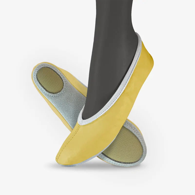 - Sport Grip: Naše cvičky Basic mají kombinovanou podešev z broušené kůže a protiskluzových oválků, což zajišťuje bezpečný pohyb při sportovních aktivitách a lehký skluz po podlaze.