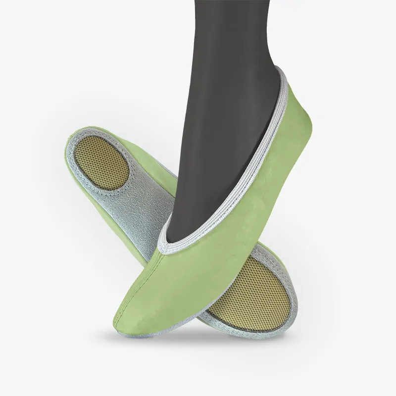 - Sport Grip: Naše cvičky Basic mají kombinovanou podešev z broušené kůže a protiskluzových oválků, což zajišťuje bezpečný pohyb při sportovních aktivitách a lehký skluz po podlaze.