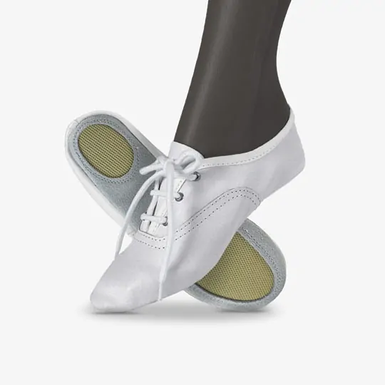 - Sport Grip: Naše cvičky Talent mají kombinovanou podešev, která zajišťuje lehké otočení na špičce či patě díky kožené části a zároveň bezpečný pohyb díky protiskluzovým oválkům. Ideální pro taneční tréninky, mažoretky a další profi sporty.